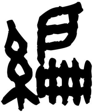 “编”字,繁体为“編”。甲骨文写作 ,小篆写作 。形声字,从糸、扁声。甲骨文的“编”,由“糸”和“册”构成:“糸”是丝束连结之形;“册”是书简、简册。纸张发明以前,人们所使用的书册通常是用丝绳将竹简串连而成,称为“编”。现在的“编”字,是由小篆演化而来的,由“糸”“户”“册”组成。“户”即门户、户籍,引申为分门别类的资料,又引申为用细绳将户籍档案,顺次排列编结在一起。故《说文·糸部》:“编,次简也。”“编”由简册之意引申为书籍、文献、史册、资料。
