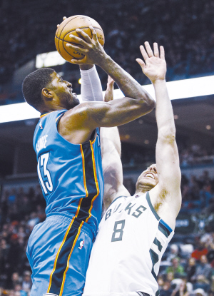 当地时间10月31日,雷霆队球员保罗·乔治(左)在比赛中进攻突破当日,在2017/2018赛季NBA常规赛中,俄克拉荷马雷霆队客场以110∶91战胜密尔沃基雄鹿队。新华社发