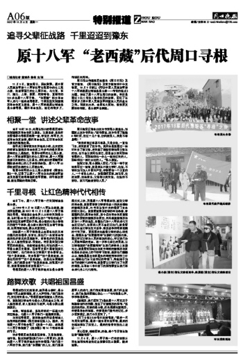 11月5日,豫东周口,深秋澄霁。原中国人民解放军第十八军首任军长张国华的女儿张小康、政委谭冠三的女儿谭齐峪,与北京、四川、湖北、上海、陕西、河南等省、直辖市的100多名原十八军子弟、“老西藏”部分革命军人后代一起组成寻根团,千里迢迢来到豫皖苏革命老区太康县、原十八军组建原址郸城县吴台庙寻根,缅怀革命先烈,追忆峥嵘岁月,传播红色精神。