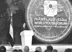 11月5日,在埃及红海海滨城市沙姆沙伊赫举行的世界青年论坛开幕式上,埃及总统塞西发表讲话。