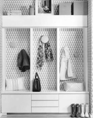 | 如果你觉得玄关只有一种颜色太单调了,可以往墙上贴壁纸啊,有了几何图案的点缀,瞬间趣味十足。把玄关柜一分为三,一家三口的衣服分开挂,这样也显得方便了许多。