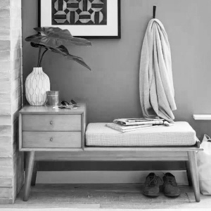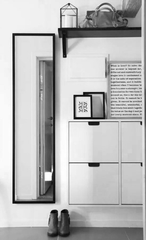 | 一面穿衣镜用来整理仪容,翻斗鞋柜宽度不大但容量够大,上面的搁板可以用来收纳包包。