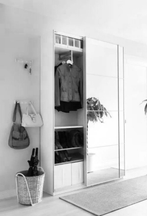 | 这样一个衣柜放在玄关,能给卧室省出很多空间(如果你的衣服不是堆成山的话),移门上还有一个大大的镜子,不经常在这里臭美一下都不甘心。旁边墙上钉几个小挂钩,用来挂钥匙和包包,再加个放雨伞的篮子,就万事俱备了。
