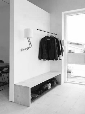 | 看这个玄关,什么多余的装饰都没有,就是让人看着神清气爽,而且该有的功能都有。超长的矮鞋架又能收纳又能坐,一盏小壁灯让你在晚上的时候不怕黑暗,最特别的是从天花板悬吊而下的钢棍,很有设计感,还能挂好多件衣服。 |