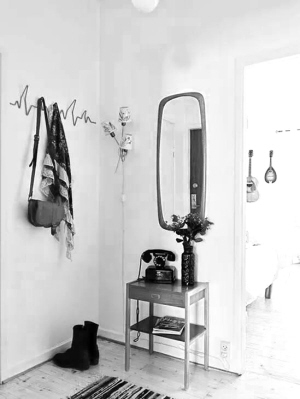 | 觉得这个玄关最棒的就是墙上的“心电图”挂钩了,本来很朴素的玄关,有了它一下子“活”了起来,而且显得创意十足、趣味多多。还有就是小玄关桌和长镜子,简简单单就打造出了小小的梳妆区。