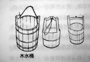 木桶和铁桶是提水或盛水用的器具,多为圆形,有的上下一样粗,有的上粗下细。中原最早出现的是柏木桶,经久耐用。