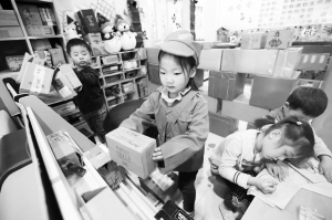 11月15日,山东青岛通济实验学校仇家由和幼儿园的小朋友在进行邮递员工作体验。