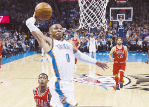 当地时间11月15日,雷霆队球员威斯布鲁克(前)在比赛中扣篮。当日,在2017~2018赛季NBA常规赛中,俄克拉荷马雷霆队主场以92∶79战胜芝加哥公牛队。新华社发