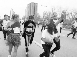观看比赛的一位女士笑着说:“他们是来参加比赛的还是来搞笑的啊?”另外一位市民说:“我在外省市举行的马拉松赛上见过身穿奇装异服的选手,他们有的是在做广告,有的则是为了娱乐。”
