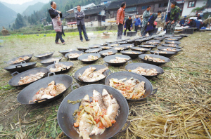 11月19日,在贵州省丹寨县龙泉镇交圭村,村民把酸汤鱼分装在铁锅里。