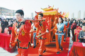 11月10日上午,在周口首届大型相亲会开幕式上,“红霞婚庆”以最强阵容亮相。锣鼓喧天,彩旗飘扬,身穿红色礼服、骑着高头大马的“新郎”走在前面,身后跟着满脸欢喜的“媒婆”和大红花轿。“新郎”牵着“新娘”跨过布袋、火盆和马鞍,祈愿以后的日子兴旺 、红红火火、平平安安。然后,“新郎”“新娘”开始祭天地、拜高堂。接下来,汉代婚礼仪式上演。汉代婚礼仪式简朴明了,重表达夫妻之义和结发之恩。舞台上,“新郎”“新娘”身着端庄的玄色礼服,整个婚礼仪式震撼人心。不同时代的婚礼秀 ,不仅展示了中国传统婚礼的喜庆热闹,而且展现了中国博大精深的传统婚礼文化。