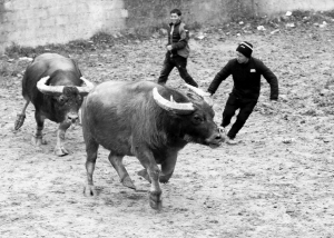 11月20日,在贵州省从江县东朗镇松刀斗牛场,两头斗牛在狂奔。