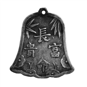 此挂牌为银质,高3.4厘米,重4.8克,从做工来看,应为清末民初之物,从底侧观察,挂牌采用压模工艺制成,整体为古钟形,顶端有挂孔,表面除自然磨损的痕迹外,还有一层黄褐色包浆。牌面地章为细密的鱼子纹,像无数珍珠镶嵌于上,中间顺读为楷书“长命富贵”,字体工整朴拙。字四周分别装饰有竹叶和梅花纹饰,花叶纹表现细腻,甚至连梅花花瓣上细小的花蕊、花丝都能看到,牌面边侧一圈有留白边框。在挂牌的反面偏中方位,有长方形银号戳记,虽然模糊,但细辨之下,仍能认出为“老宝兴”三字,这是旧上海的一家著名银店。