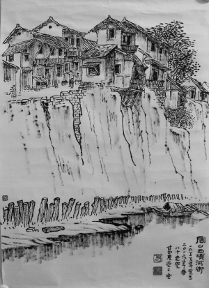 顺河堤而建的吊脚楼很有南方民居的风韵,几经风霜雨雪的洗礼,尤显飘逸秀美。西顺河街位于沙颍河老桥南头西侧,是一条主要的商业街,在这里经商的大都是南方商人。此作品写生于1955年,画的是西顺河街西段。