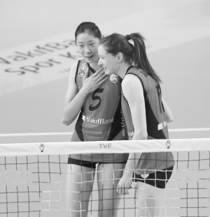 当日,瓦基弗银行队球员朱婷(左)与队友斯洛特耶斯在比赛中交谈。