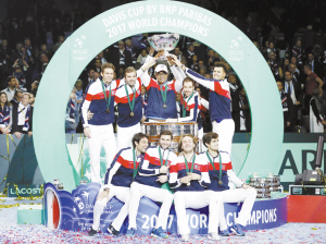 当地时间11月26日,法国队在颁奖仪式上庆祝。当日,在法国里尔举行的2017年戴维斯杯男子网球团体赛世界组决赛第五场比赛中,法国队选手普耶以3∶0战胜比利时队选手达尔西斯,法国队以3∶2的总比分战胜比利时队,捧得戴维斯杯。