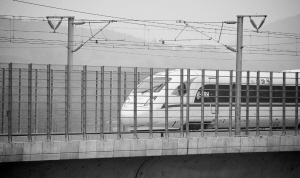 11月27日,一列动车组试验列车通过装有朱鹮防护网的西成高铁赵家岭特大桥。