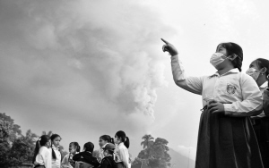 11月28日,在印度尼西亚巴厘岛,几名学生戴着口罩观看阿贡火山喷发。