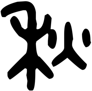 “秋”字,繁体为鞦,异体为“秌”。甲骨文字形写作 ,上边是一只蟋蟀,一说为蝗虫,下边放着一个火盆。蟋蟀等秋虫通常于秋天在庄稼地鸣叫,借以表示庄稼成熟的秋天。火盆表示火烧秋虫,一是可以消灭害虫,二是通过烧秸秆来重新滋养土地。火烧秋虫和秸秆是古代焚田之习俗,也是秋天成熟季节的象征。“秋”字的大篆写作 ,左边是秋天的禾苗,沉甸甸的谷穗已经压弯了腰,象征着成熟的状态;右边是个“火”字,表示庄稼秸秆焦黄,果实火一样红。“秋”字小篆字形写作 ,“火”与“禾”并列。现在的楷体字形,“火”与“禾”移位,演变为“秋”。