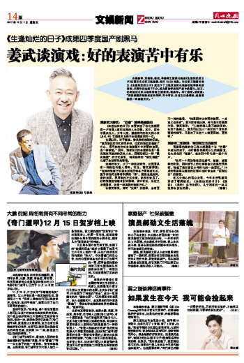 由张嘉译、刘佩琦、姜武、车晓等主演的电视剧《生逢灿烂的日子》目前正在北京卫视热播,每天19:30两集。在北京卫视播出首日,《生逢灿烂的日子》就拿下了卫视黄金档电视剧收视率排名的首位,豆瓣评分达到8.5分,成为第四季度国产剧中的黑马。近日,记者通过北京卫视采访到主演姜武、张嘉译。对于演戏,姜武说:“好的表演应该像卓别林那样,苦中有乐,乐过之后是眼泪,这是高级的一种表演方式。”