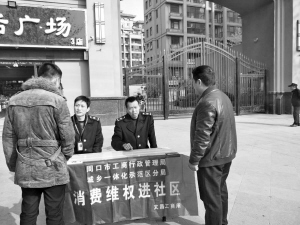 11月29日,周口市工商局城乡一体化示范区分局文昌工商所两名执法人员,来到中心城区庆丰路中段观澜国际小区门口的工商进社区维权服务点,现场接受市民咨询和投诉。