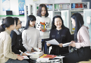12月4日,北京理工大学马克思主义学院常务副院长李林英(右二)在辅导参加思想政治课演讲的学生。
