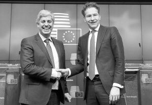 12月4日,在比利时首都布鲁塞尔欧盟总部,欧元集团新当选主席、葡萄牙财政部长马里奥·森特诺(左)与现任主席戴塞尔布卢姆握手。