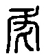 “虎”是一个象形字。甲骨文写作 ,金文写作 ,都是老虎的侧面形象。其上部是虎头,中间是虎身,下部是虎尾,左部是虎腿。巨头、大口、利齿、卷尾,张牙舞爪,一副凶相。《说文》:“虎,山兽之君。”