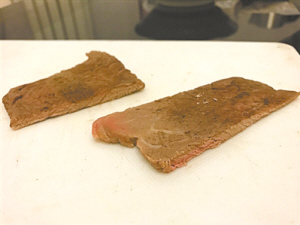 随后,选取上述实验过程中发热温度较高的两种暖宝宝,分别用两片贴在牛肉片正反面。将牛肉片放在枕头下,观测样品变化。