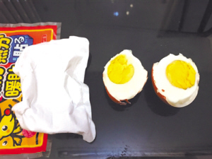 实验结果:1小时后,将6个鸡蛋从衣服中取出,用手接触鸡蛋时,有明显烫手的感觉。记者随后用刀从中间切开6个鸡蛋,发现由暖宝宝样品A、B包裹的两个鸡蛋已经变成半熟的“溏心鸡蛋”,其他4个鸡蛋的蛋清和蛋黄偏生。