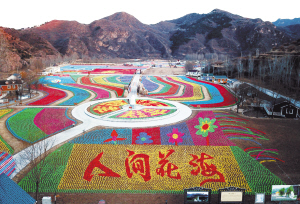 从空中俯瞰北京市密云区车道峪村用风车打造的“人间花海”主题景观(12月5日摄)。