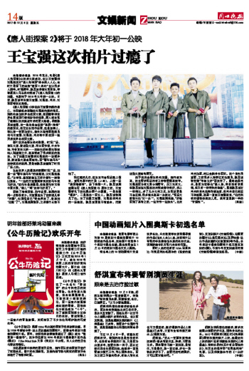 本报综合消息 2016年元旦,电影《唐人街探案》公映后大获成功,也让王宝强和刘昊然这对“唐人街神探”组合深入人心,当时片尾留下的线索“唐探2·纽约”也让很多人期待。时隔两年,陈思诚导演兑现承诺,带着原班人马在纽约完成了《唐人街探案2》的拍摄,电影将于2018年大年初一公映。日前,陈思诚率主演王宝强、刘昊然、肖央、刘承羽等欢乐亮相。