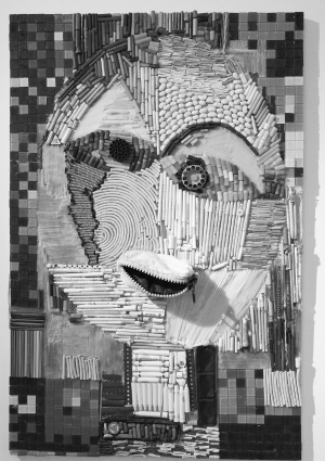 这是展览上展出的12岁学生王于前创作的美术拼贴作品(12月9日摄)。喜爱画画的王于前用在校内征集的废弃文具创作了这幅作品。