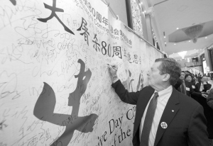 12月9日,在加拿大多伦多,多伦多市长约翰·托里在追思会的“铭记历史、祈愿和平”条幅上签名。