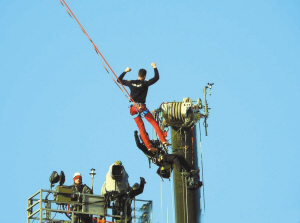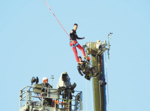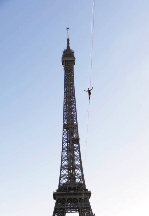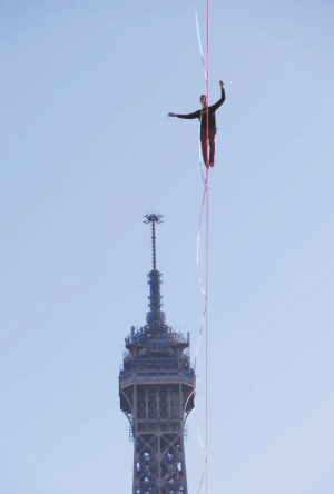 当地时间2017年12月9日,法国巴黎,法国高空扁带极限运动员纳坦·保兰参加慈善挑战活动,完成埃菲尔铁塔和Trocadero广场之间高空扁带挑战。