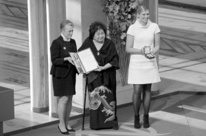 国际非政府组织“国际废除核武器运动”负责人贝亚特丽斯·菲恩和广岛原子弹爆炸幸存者节子·瑟洛10日在挪威首都奥斯陆代表该组织领取了2017年诺贝尔和平奖。新华社记者 梁有昶 摄