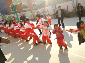 “我们放声歌唱你啊,庄严的国旗……”运动会开始前,小学生们进行了诗歌朗颂,并第一次举行了升国旗仪式。在接下来的篮球、羽毛球、乒乓球、呼啦圈、拔河比赛中,小学生们争先恐后,发挥出最好水平,取得优异成绩。
