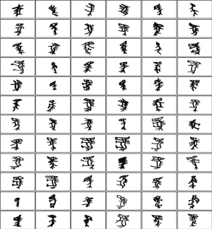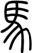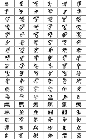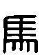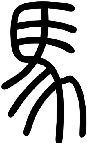 “马”字是一个典型的象形字。早期甲骨文“马”字写作 ,是一匹头、身、足、尾俱全的马的形象,马头朝上,背朝右,下部是四条腿,还有马鬃和马尾。四期甲骨文“马”字写作 ,书写比较简便,但形象犹存。金文写作 、篆书写作 、隶书写作 ,皆与甲骨文相似,而简化的“马”字一点也不像马的形象了。