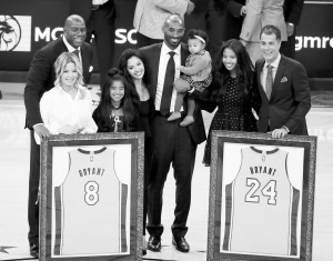 当日,科比与家人、嘉宾在退役仪式上合影。