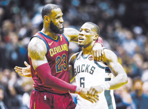 当地时间12月19日,骑士队球员勒布朗·詹姆斯(左)与雄鹿队球员布莱德索比赛后拥抱。当日,在2017~2018赛季NBA常规赛中,密尔沃基雄鹿队主场以119∶116战胜克利夫兰骑士队。