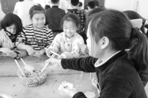 对于李方口村的留守儿童来说,很多人都是第一次包饺子,不过这丝毫不影响大家参与的热情。和女生相比,男生显得更加活跃,没听完老师讲的包饺子的要领,他们就动手偷偷包起来,但都是以失败告终。“以前只见过爸妈包饺子,我没有试过。这次我包得不少,但很难看,有的饺子馅都露出来了。”三年级学生李明月笑着说。活动现场,孩子们一个个兴致勃勃,学得有模有样(如图)。当热腾腾的饺子端上桌子,所有的学生都围了上来,大家争先恐后地寻找自己包的“另类”饺子,现场笑声不断。