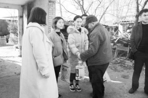 12月21日,冬至前夕,周口联营职业中专学生社团负责人侯佳雨(左三)和同学们一起为学校邻近的搬口办事处搬口村4户贫困家庭送去了水饺等慰问品。侯佳雨说,买东西的钱都是同学们从生活费中省出来的,“关爱贫困户,咱也出份力” 。