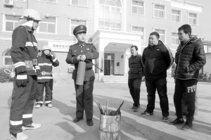 12月23日,在河北省三河市燕郊镇西柳河屯村微型消防站外,三河市公安消防大队的专职消防员为村民讲解灭火器的使用方法。
