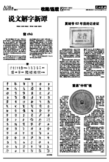 古文字“豬”字中的“豕”为什么后来换成了“犬”(作偏旁写为“犭”),这要从古代治水英雄张渤的故事说起。古代民间所推崇的治水英雄除大禹之外,还有一位张大帝——猪神张渤。传说张渤是汉代人,他也是因治水救灾而成神的。他治水时,化为一头大猪,用嘴拱土,用身开道。他的夫人李氏每天给他送饭,约定击鼓为号。他听到鼓声,就又化还人身,与夫人相见。有一次夫人忘了敲鼓,张渤的猪形被夫人看见,他就化为一阵清风隐去了。人们为了纪念张渤的功绩,为他立了神位加以供奉,但因他曾化为猪形,所以在给他的祭品中隐去常用的“猪头”,换上了狗,把“豬”字写成了“猪”。