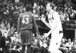 当日,小牛队球员诺维茨基(右)在比赛中庆祝得分。
