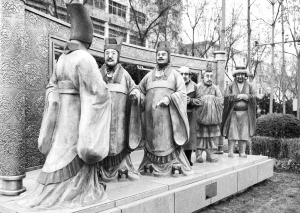 12月26日,在西安市雁塔雕塑示范街上拍摄的取材于唐章怀太子墓壁画《客使图》的雕塑作品“客使八方”。