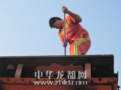 待铺路基清理完毕后,常俊华和同事开始铺设沥青。常俊华的同事提醒记者:“机器里搅拌的沥青的温度有七八十摄氏度,注意别烫着了。”在此期间,由于拌料机下料不顺畅,常俊华两次爬上拌料机,用铁杆疏通拌料机里的沥青。