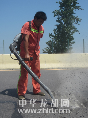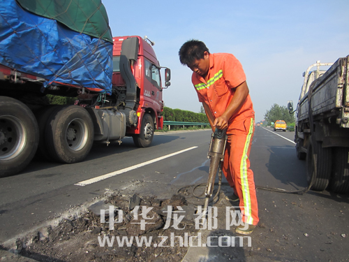 “由于路面是用沥青浇筑的,吸热厉害,如果气温超过30摄氏度,地表温度就得在50摄氏度以上。”常俊华边说边拿着破拆设备拆除破损路基。在同事的协助下,经过20分钟的忙碌,破损路基终于被拆除完毕,而常俊华身上的工作服也已湿透。常俊华介绍:“破拆设备有几十公斤重,工作时,设备温度能达70摄氏度,我就像抱着个火炉。这活儿只要干,谁都是一身汗。”