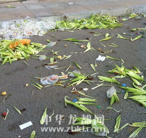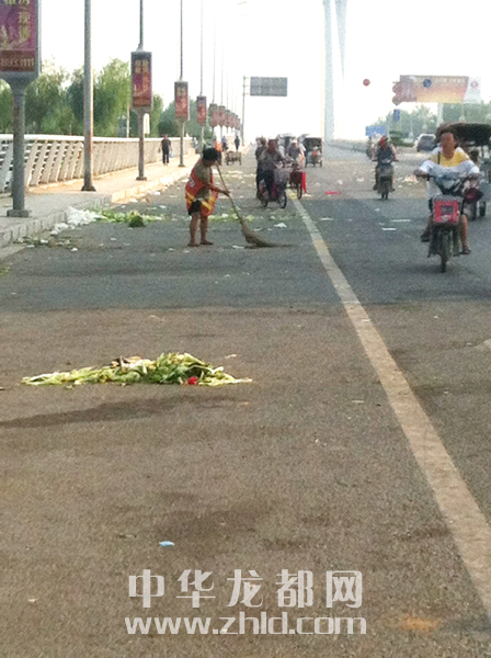 龙都网讯 (见习记者 张倩影 )8月15日上午7点40分左右,记者经过大庆路与人民路交叉口,看到大庆路桥南头一侧的路上,满地的垃圾,来来往往的上班人群和车辆,纷纷躲避,交通混乱。两名清洁工分至两头,吃力地打扫着这满地的垃圾。