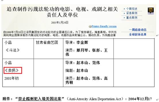 2001年的春节联欢晚会上,赵本山、范伟、高秀敏合作演出了小品《卖拐》,获得当年春晚语言类节目一等奖,好评如潮。然而,这件事却惹恼了法轮功教主李洪志,他授意自家的“追查迫害法轮功国际组织”将赵本山列入“追查黑档案”,即发表了《追查制作污蔑法轮功的电影、电视、戏剧之相关责任人及单位》,赵本山和他的小品《卖拐》“有幸”入围(图一)。